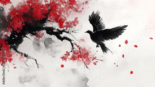 Black bird with red blossoms, and spring flight.