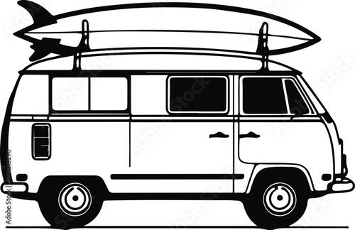 Black bold outline with white background, Minimal single line art of camper van with surfboard on roof 1