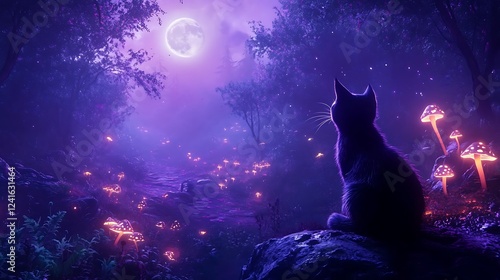 Black Cat Gazing at a Full Moon in a Glowing Forest