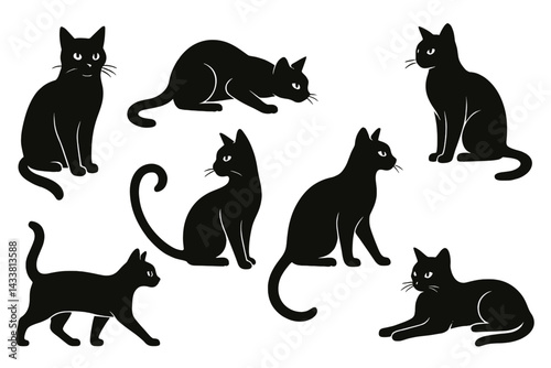 Black cat silhouette icon set featuring various poses and expressions for creative design projects