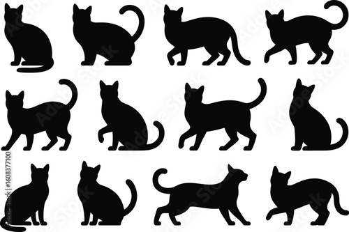 Black cat silhouettes in various poses feline white background