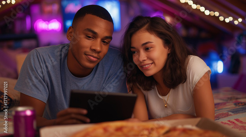 Black couple lounging in a cozy attic room turned into a gaming den sharing a tablet to check generic gaming forums pizza slices and soda cans nearby neon lights and gaming post