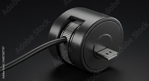Black cylindrical device with knurled knob USBC port cable emerging