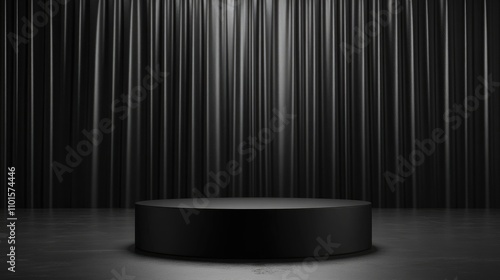 Black cylindrical podium display illuminated against a backdrop of flowing dark curtains in an empty room setting.