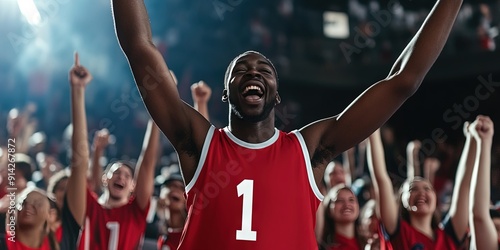 black fan cheering in basketball stadium, blank red basketball jersey, white trim, white number "1"