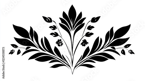 Black floral design; elegant, symmetrical; white background; for invitation or decoration