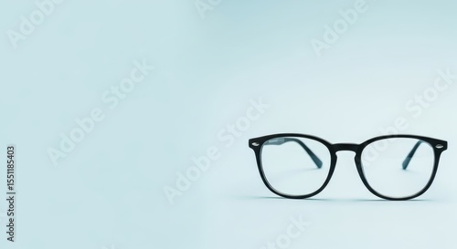 Black framed eyeglasses on a light blue background perfect for vision care and optical advertising