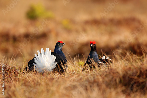 Black grouse on the bog meadow. Lekking nice bird Grouse, Tetrao tetrix, in marshland, Sweden. Spring mating season in the nature. Wildlife scene from north Europe.