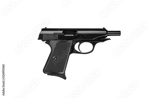 Black gun pistol isolated on white background. Short-barreled weapons for sports and self-defense. Armament for police units, special forces and the army.