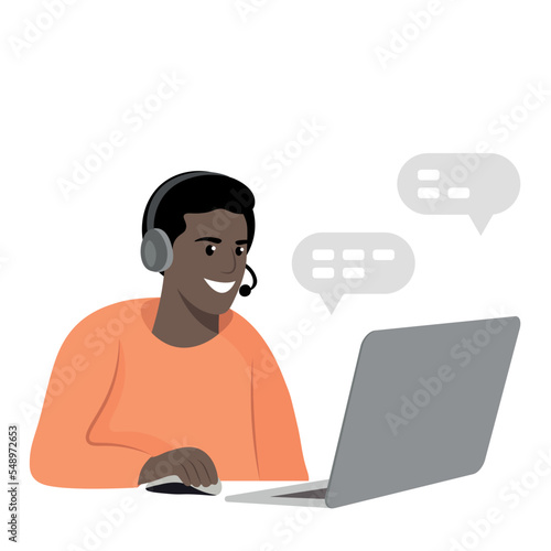 Black guy in headphones with laptop, call center worker, online, home office, flat vector, isolated on white