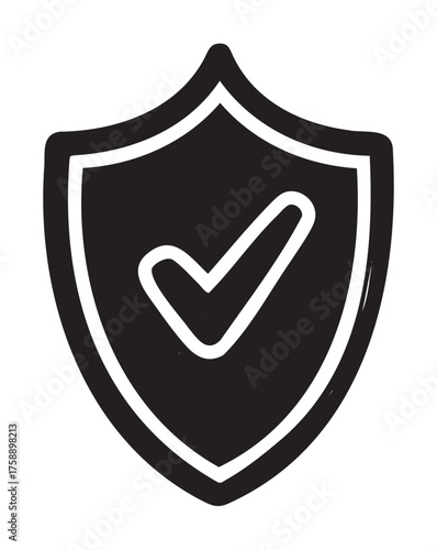 Black icon of a shield with a checkmark inside, symbolizing security and protection.