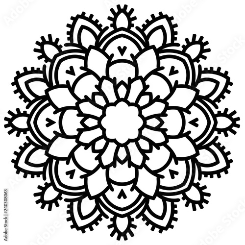 Black ornamental round doodle flower isolated on white background. Outline mandala. Geometric circle element. Vector illustration.
