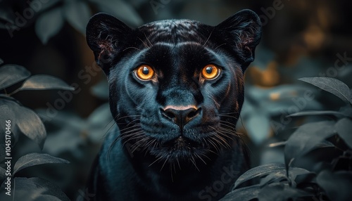 Black panther with bright yellow eyes resting among dark foliage in the wild