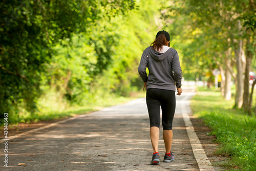 Black side of sporty woman in sportswear stand on road at park warm up befor jogging