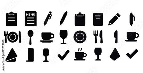 Black silhouette icons of dining utensils and stationery