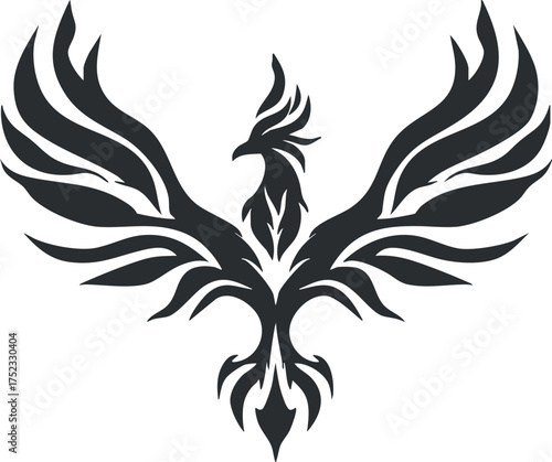 Black silhouette of a mythical phoenix bird with outstretched wings, symbolizing rebirth and power.