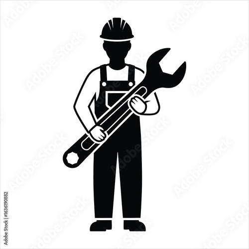 Black silhouette of a worker wearing overalls and hard hat holding a large wrench black and white