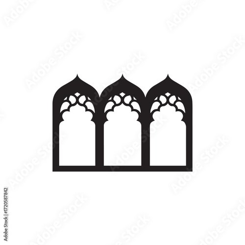 Black silhouette showcases three arched window structures isolated against the white background