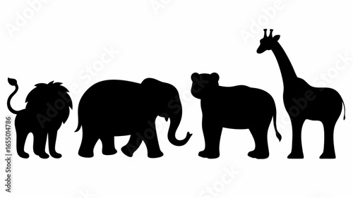 Black silhouettes of a lion elephant tiger and giraffe standing in a row on a white background image | editable eps vectors