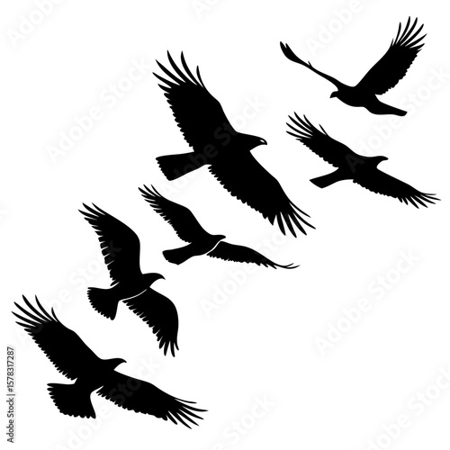 Black silhouettes of birds in flight flying wings spread