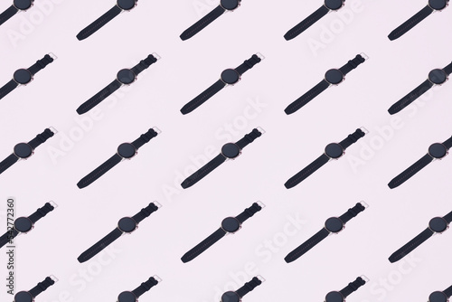 Black smart watch on a purple background. Minimal pattern.