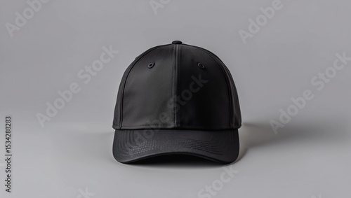 Black snapback cap mockup on a grey background, front view