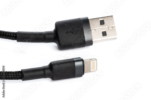 Black USB braided cable - Lightning isolated on a white background, close -up. (selective focus)