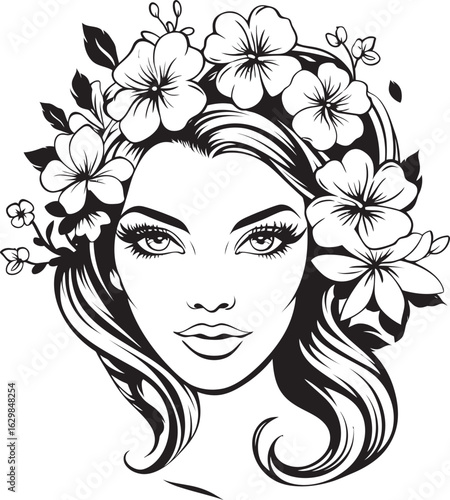 Black Vector Icon of Woman Face with Floral Styling Woman Face with Stylized Flower Decor Vector Black Logo