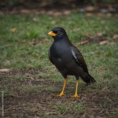 Black wild bird, a common blackbird (Turdus merula) with a black beak, stands on the green grass in nature