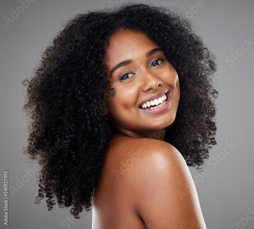 Black woman afro, beauty and smile for skincare, cosmetics or treatment against grey studio background. Portrait of happy isolated African American female smiling with teeth in care for perfect skin