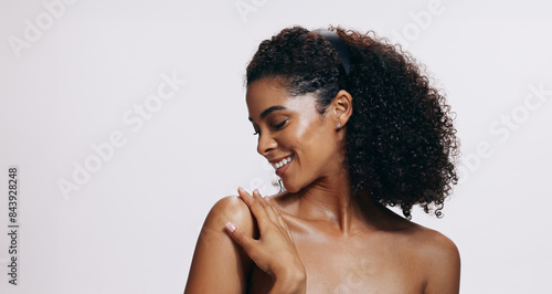 Black woman, natural beauty and skin glow from body care, dermatology and wellness in studio. Cosmetics, facial and smile from skincare and collagen treatment results with white background and mockup