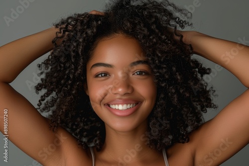 Black woman with afro in studio stroking her hair after salon treatment. Happy, healthy, curly-haired female model on gray background.