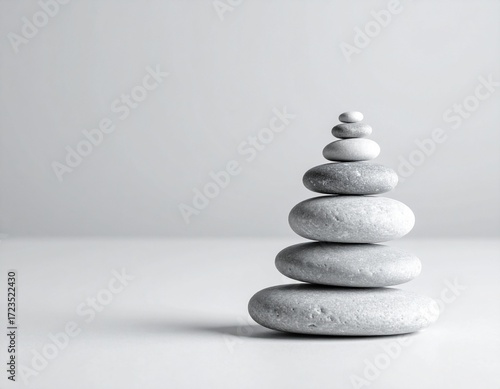Black zen stones stacked in a smooth pyramid on a wooden table for balance and harmony