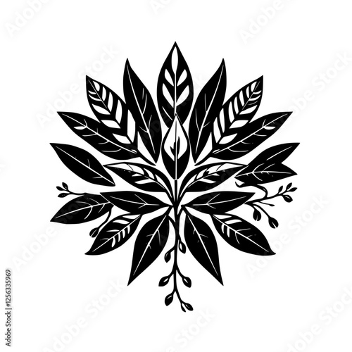 Black-and-white composition of plant leaves arranged in a circular formation, symmetrical and pattern-like.