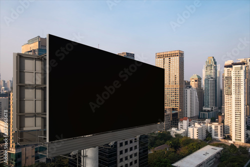 Blank black road billboard with Bangkok cityscape background at sunset. Street advertising poster, mock up, 3D rendering. Side view. The concept of marketing communication to promote or sell idea.