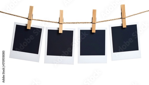 Blank Polaroids Hanging on a Rope with Clothespins on White Background.