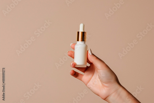 Blank serum bottle jar mockup in hand on beige backdrop