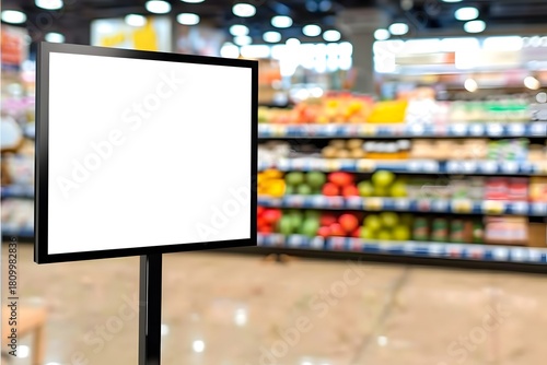 Blank Signage Display in Grocery Store Aisle / Empty Promotional Board in Supermarket Interior