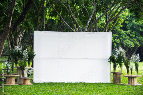 Blank white empty space big screen advertising banner fabric mock up template in outdoor green tropical garden public park.