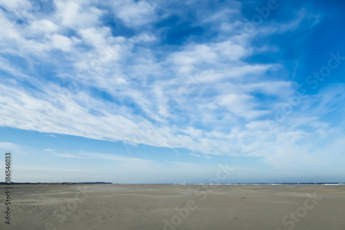 Blauer Himmel mit breitem Sandstrand an Nordseeküste