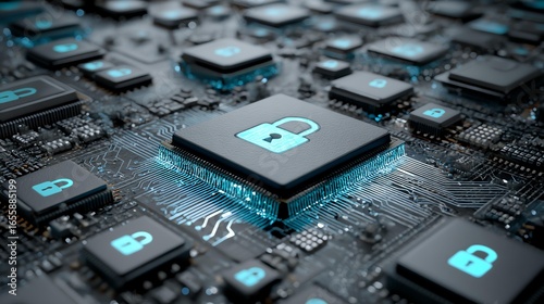 Blockchain data integrity concept, Close-up view of microchips with security lock icons, design concept.