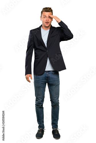 Blonde handsome man has just realized something and has intending the solution