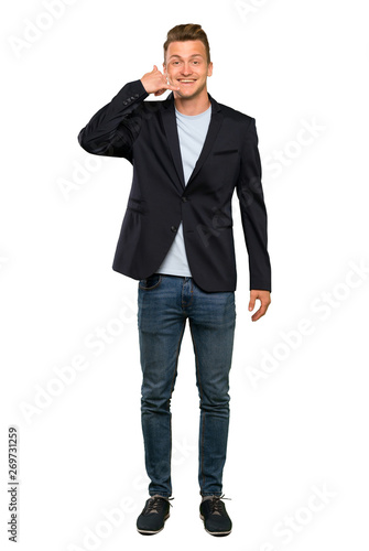 Blonde handsome man making phone gesture. Call me back sign