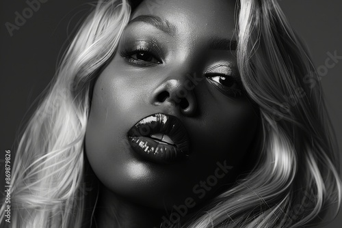 Blonde woman with long curly hair and perfect makeup. Black and white photograph. Salon Haircare or Skincare. Perfect hair and Smooth Skin