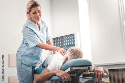 Blonde-haired chiropractor checking spine of elderly man
