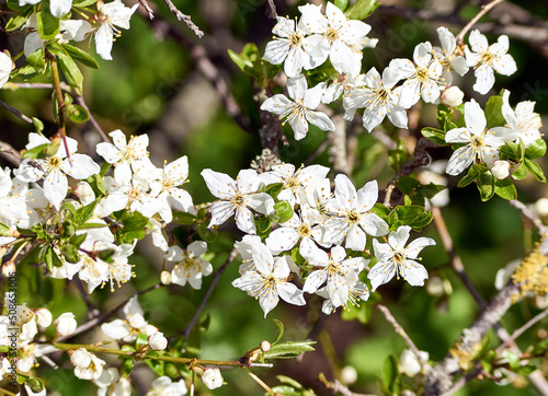 Blooming apple tree twig in springtime on a sunny day. Close-up shot.