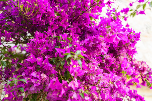 Blooming bougainvillea close-up. Summer travel, Mediterranean flora, and architectural serenity in historic towns.