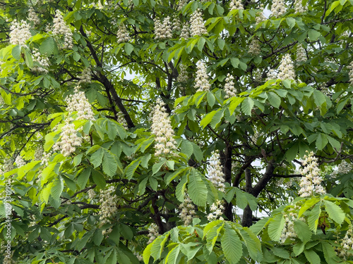 Blooming chestnut tree displaying white flower clusters in park