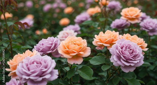 Blooming Roses in Garden with Pastel Colors Peach and Lavender