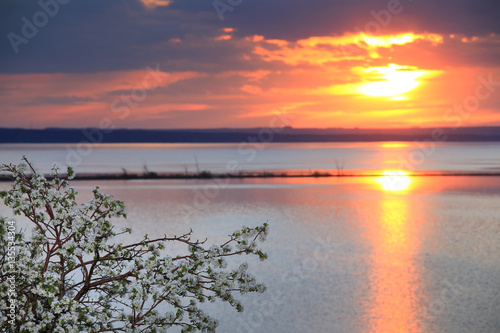 blossoming apple tree on the river bank